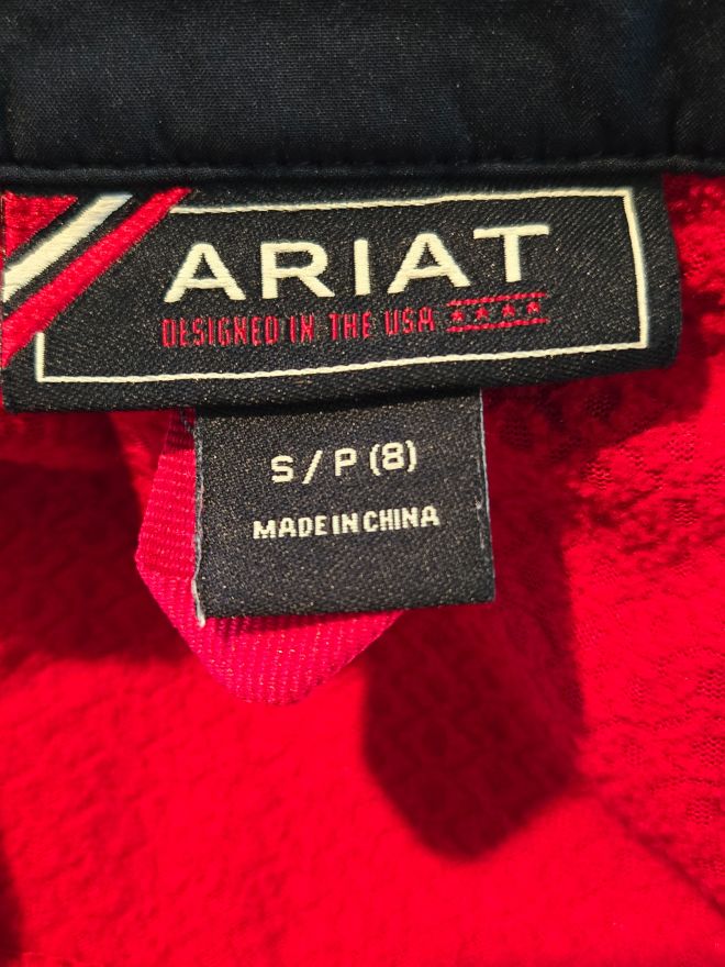 Lightly used child size small Ariat Navy & red spring barn jacket